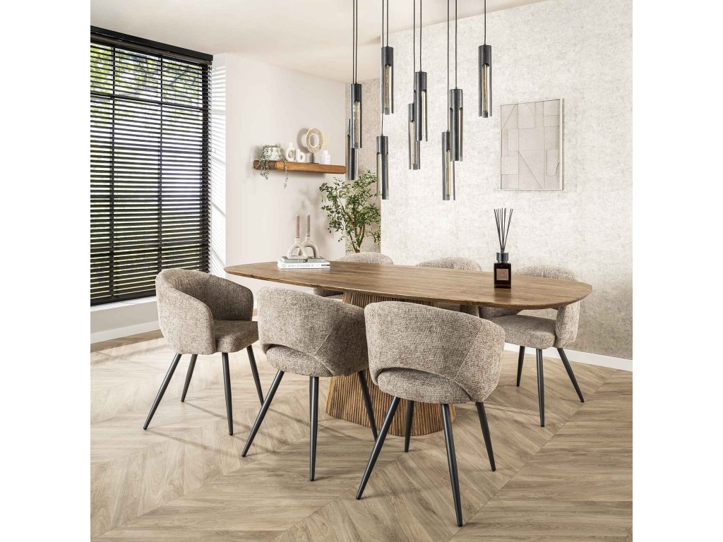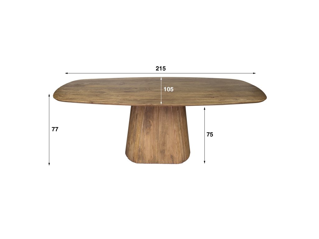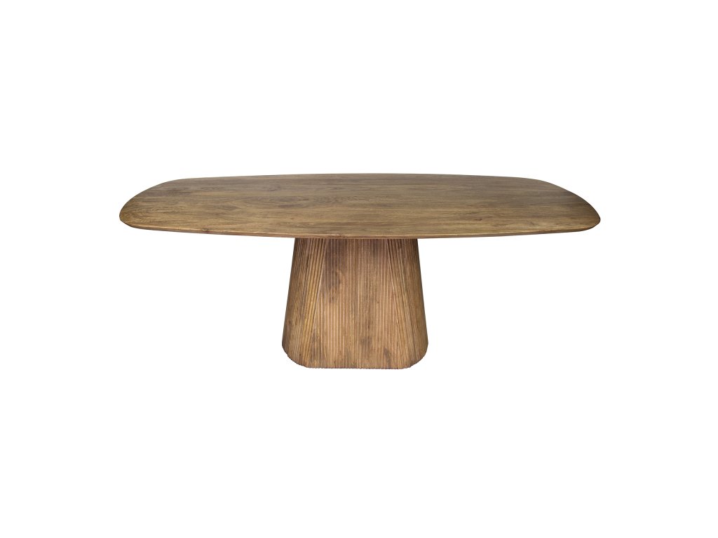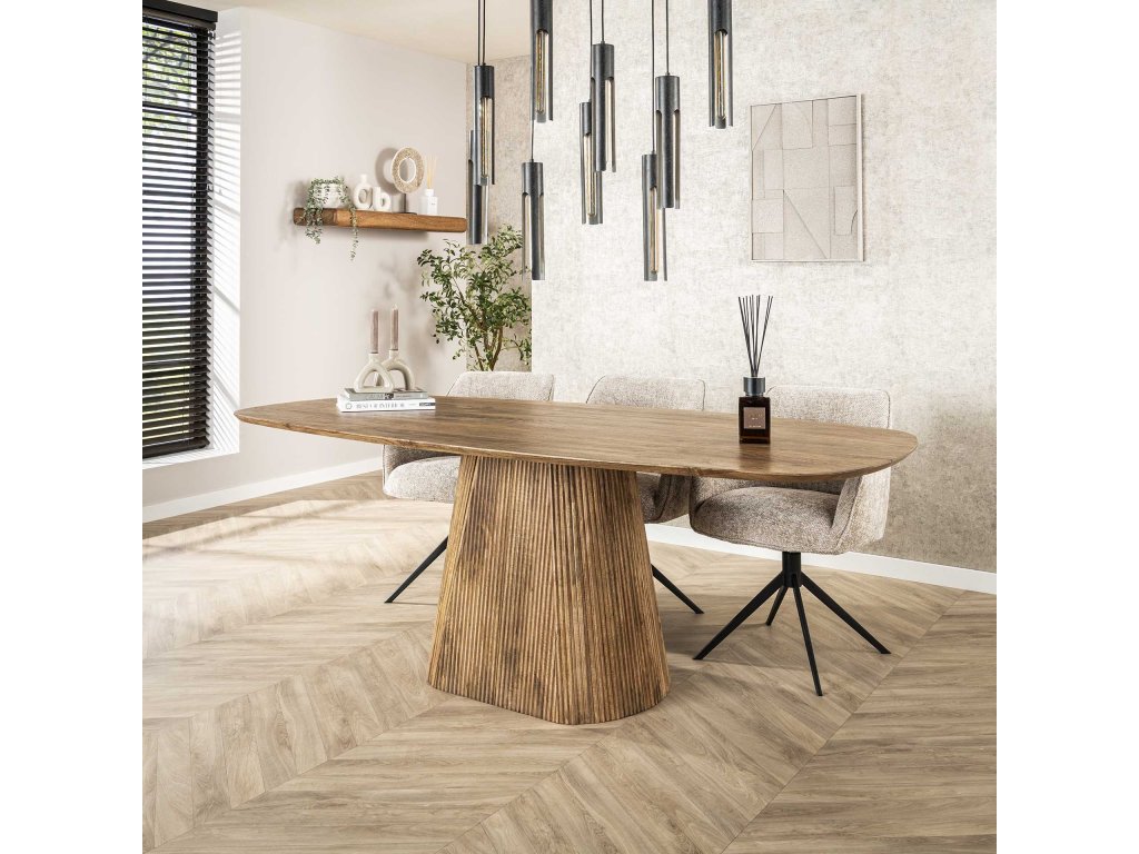 Jídelní stůl Wave má desku z mangového dřeva se zkosenou hranou a centrální nohu s unikátním vlnitým vzorem. Deska i noha stolu mají matný povrch v pískové barvě, který jim dodává přirozený a teplý vzhled. Jídelní stůl je vhodný pro 6 až 8 židlí a je součástí stylové série Wave.
