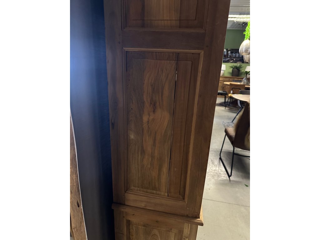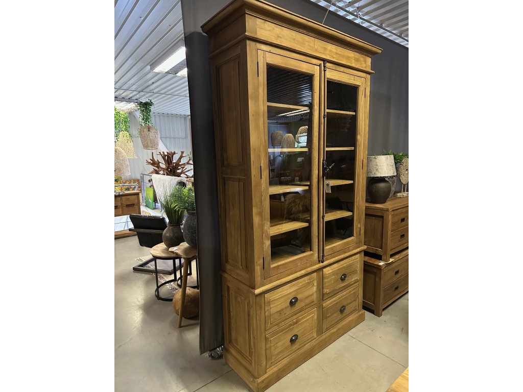prosklená skříň ITA, vel. 120/130 x 40/47 x 230 cm, teak masiv, provedení hladké, dole 4x šuplík, z boční strany je malá prasklina viz foto