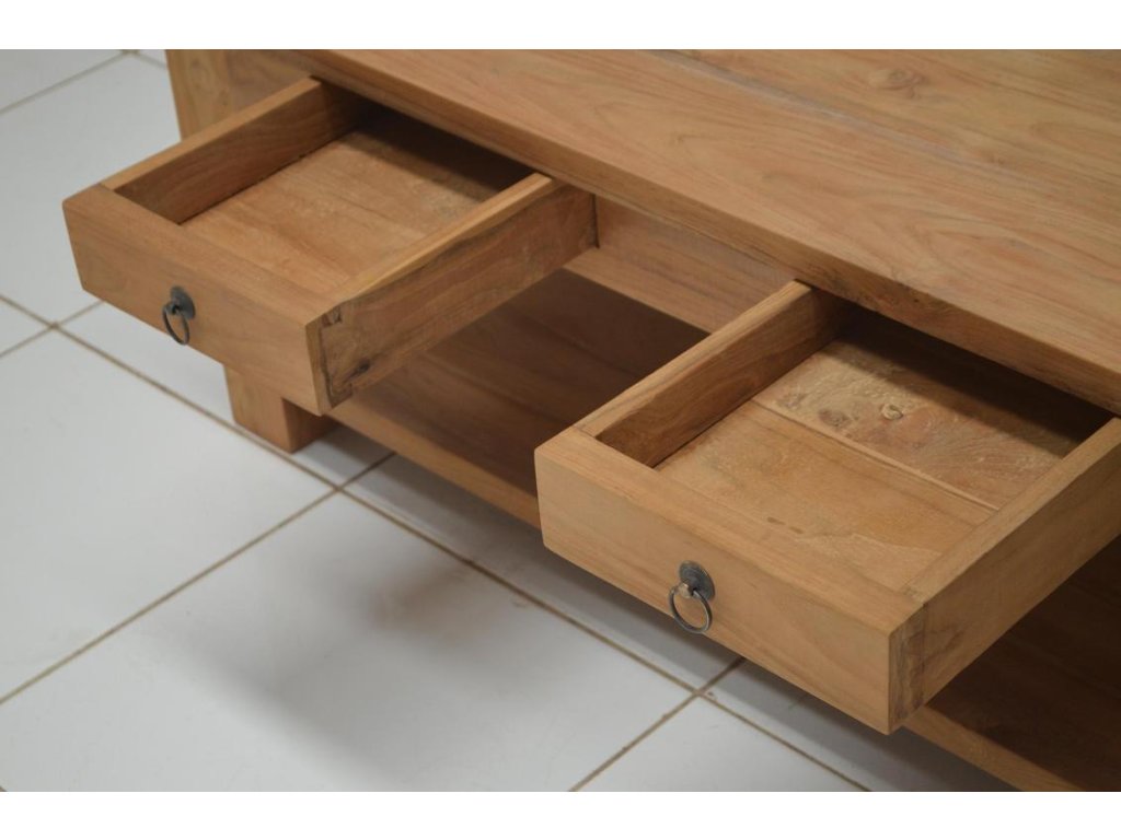 Jednoduchý ale elegantní konferenční stolek z hladkého recyklovaného teaku s jednou až dvěma zásuvkami a dolní policí. Horní deska je 3 cm silná a má přesah 1-2 cm, nohy jsou silné 8 x 8 cm. Možno objednat ve velikostech 90x90, 100x100, 120x75, 120x80, 120x120, 140x80, 160x80 cm. Více info o dostupnosti těchto provedení získáte na prodejně